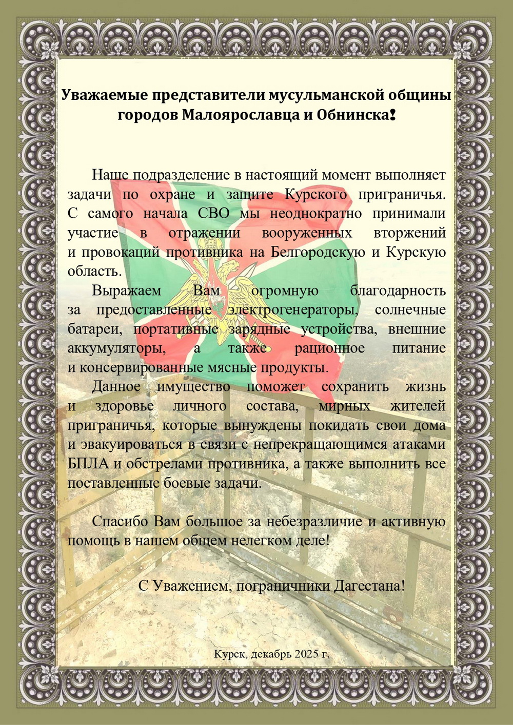 Местная религиозная организация мусульман города Малоярославца получила Благодарственное письмо от командования воинской части за помощь фронту и поддержку участников СВО.